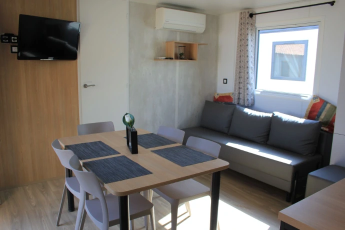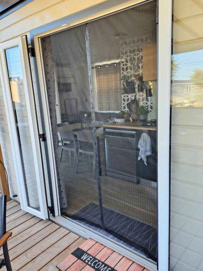 Accès à la cuisine, avec moustiquaire à la porte-fenêtre (nouveauté 2025)