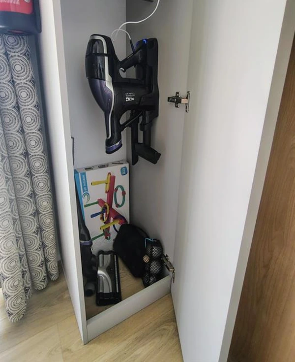 Armoire de rangement avec aspirateur sans fil, jeux de société, boules de pétanque, cendriers, fer à repasser,...)